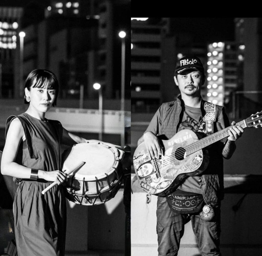 愛知は三河、豊田市を拠点に国内外で活動する大所帯バンド「TURTLE ISLAND」のフロントマンである永山愛樹(Vo,G)と竹舞(Vo,太鼓)からなる最小編成、東洋産アコースティックパンクDUO。現代アジアの原始的音楽。基本は2人だが、その時々各地で様々なメンバーが加わりながら形を変え全国津々浦々巡業を続けている。